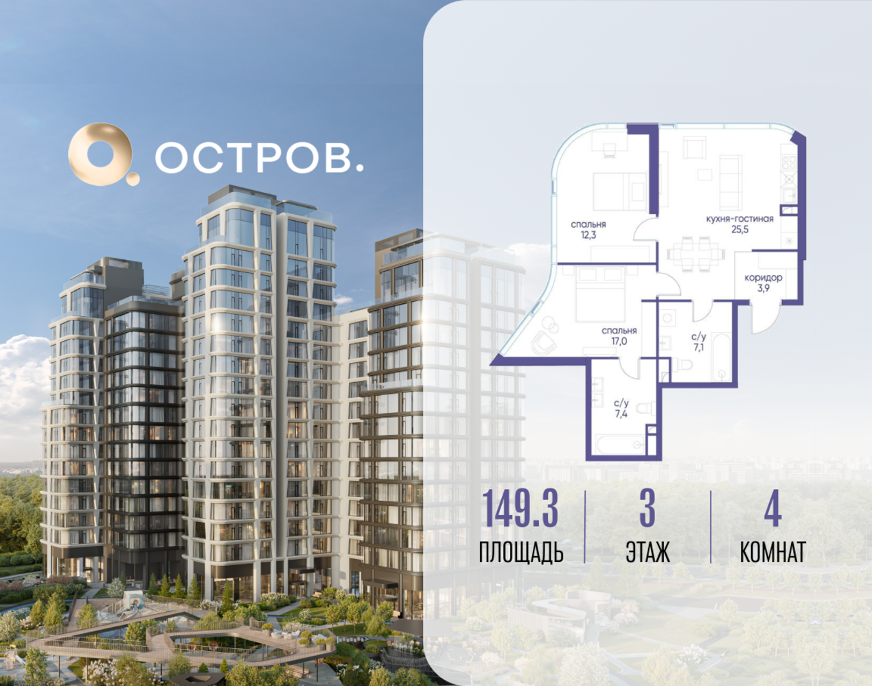 Продаётся 4-комн. квартира от застройщика: общая площадь 149.32 м², жилая 29.30 м², кухня 25.50 м², 3-й этаж, жилой квартал «Остров 12», корпус 2 (секция 1). Срок сдачи: 1 квартал 2029 года. 2 совмещенных санузла. В жилой зоне 2 больших окна на одну сторону, хорошая инсоляция. Позвоните сейчас и забронируйте квартиру! ОСТРОВ от Донстрой — жилой комплекс на западе Москвы, в Мневниковской пойме. Уникальное преимущество комплекса — в том, что он обособлен от города рекой и природным парком (650 га). Благодаря природному окружению эта территория имеет лучший экологический рейтинг в столице. Кварталы ОСТРОВА объединены ландшафтным дизайном в единое пространство — с набережными и Центральным бульваром. На ОСТРОВЕ любые объекты, необходимые для полноценной жизни и отдыха, находятся на расстоянии 15-минутной прогулки. Торговый центр и супермаркеты, кафе и рестораны, фитнес, салоны красоты, школы и детские сады. А также крупнейший в Москве спортивный кластер.