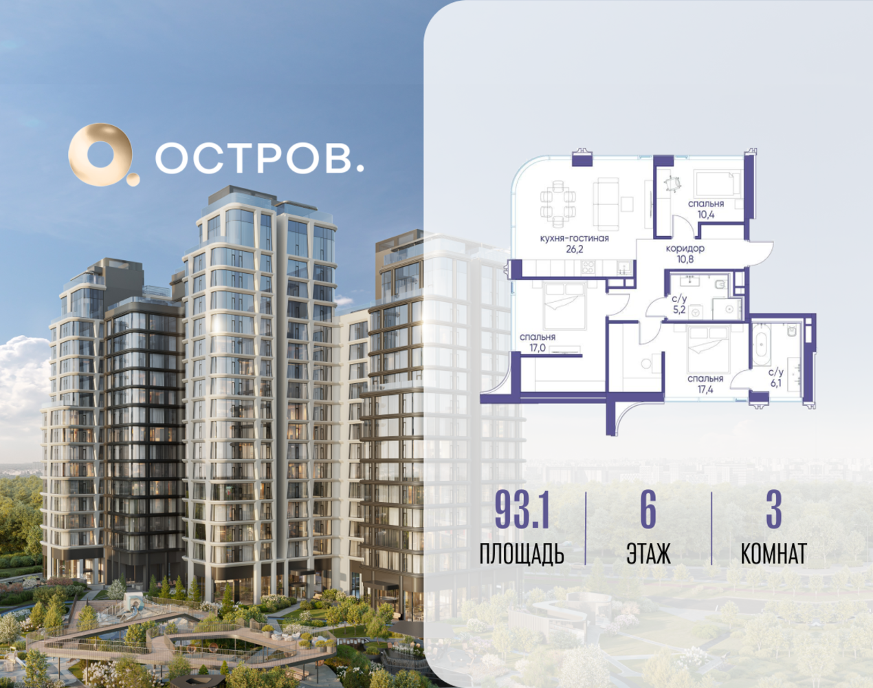 Продаётся 3-комн. квартира от застройщика: общая площадь 93.12 м², жилая 44.80 м², кухня 26.20 м², 6-й этаж, жилой квартал «Остров 12», корпус 2 (секция 2). Срок сдачи: 1 квартал 2029 года. 2 совмещенных санузла. В жилой зоне 2 больших окна на одну сторону, хорошая инсоляция. Позвоните сейчас и забронируйте квартиру! ОСТРОВ от Донстрой — жилой комплекс на западе Москвы, в Мневниковской пойме. Уникальное преимущество комплекса — в том, что он обособлен от города рекой и природным парком (650 га). Благодаря природному окружению эта территория имеет лучший экологический рейтинг в столице. Кварталы ОСТРОВА объединены ландшафтным дизайном в единое пространство — с набережными и Центральным бульваром. На ОСТРОВЕ любые объекты, необходимые для полноценной жизни и отдыха, находятся на расстоянии 15-минутной прогулки. Торговый центр и супермаркеты, кафе и рестораны, фитнес, салоны красоты, школы и детские сады. А также крупнейший в Москве спортивный кластер.
