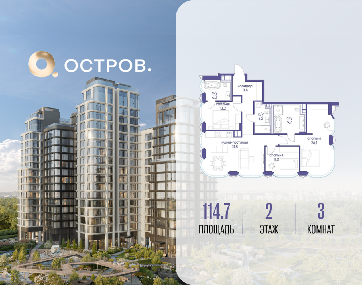 Продаётся 3-комн. квартира от застройщика: общая площадь 114.72 м², жилая 50.30 м², кухня 31.80 м², 2-й этаж, жилой квартал «Остров 12», корпус 2 (секция 1). Срок сдачи: 1 квартал 2029 года. 3 совмещенных санузла. В жилой зоне 2 больших окна на одну сторону, хорошая инсоляция. Позвоните сейчас и забронируйте квартиру! ОСТРОВ от Донстрой — жилой комплекс на западе Москвы, в Мневниковской пойме. Уникальное преимущество комплекса — в том, что он обособлен от города рекой и природным парком (650 га). Благодаря природному окружению эта территория имеет лучший экологический рейтинг в столице. Кварталы ОСТРОВА объединены ландшафтным дизайном в единое пространство — с набережными и Центральным бульваром. На ОСТРОВЕ любые объекты, необходимые для полноценной жизни и отдыха, находятся на расстоянии 15-минутной прогулки. Торговый центр и супермаркеты, кафе и рестораны, фитнес, салоны красоты, школы и детские сады. А также крупнейший в Москве спортивный кластер.