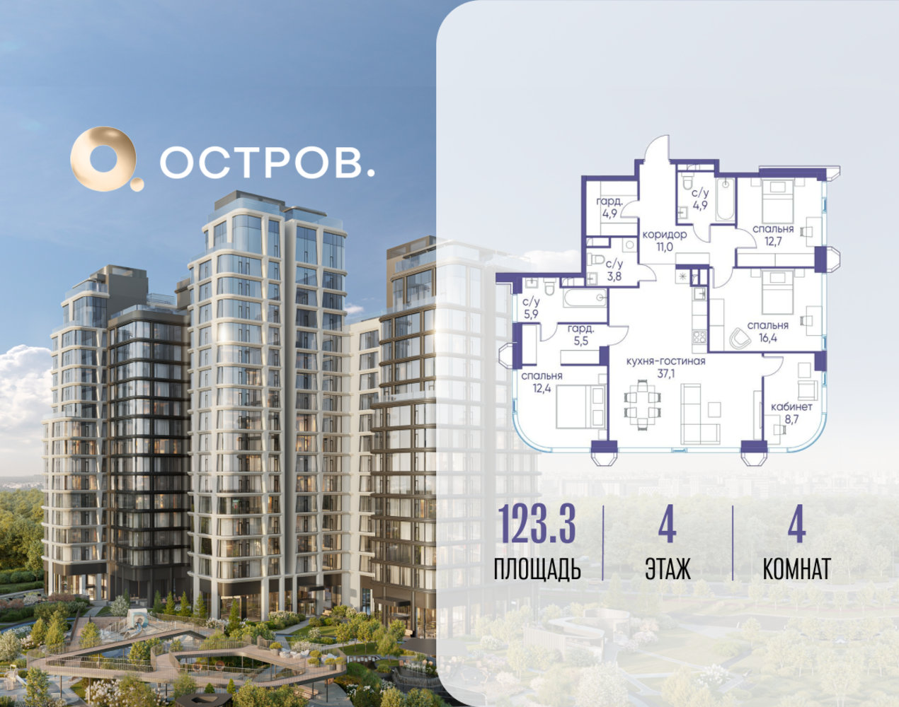 Продаётся 4-комн. квартира от застройщика: общая площадь 123.32 м², жилая 50.20 м², кухня 37.10 м², 4-й этаж, жилой квартал «Остров 12», корпус 1 (секция 2). Срок сдачи: 1 квартал 2029 года. 3 санузла (1 раздельный и 2 совмещенных). В жилой зоне 2 больших окна на одну сторону, хорошая инсоляция. Позвоните сейчас и забронируйте квартиру! ОСТРОВ от Донстрой — жилой комплекс на западе Москвы, в Мневниковской пойме. Уникальное преимущество комплекса — в том, что он обособлен от города рекой и природным парком (650 га). Благодаря природному окружению эта территория имеет лучший экологический рейтинг в столице. Кварталы ОСТРОВА объединены ландшафтным дизайном в единое пространство — с набережными и Центральным бульваром. На ОСТРОВЕ любые объекты, необходимые для полноценной жизни и отдыха, находятся на расстоянии 15-минутной прогулки. Торговый центр и супермаркеты, кафе и рестораны, фитнес, салоны красоты, школы и детские сады. А также крупнейший в Москве спортивный кластер.