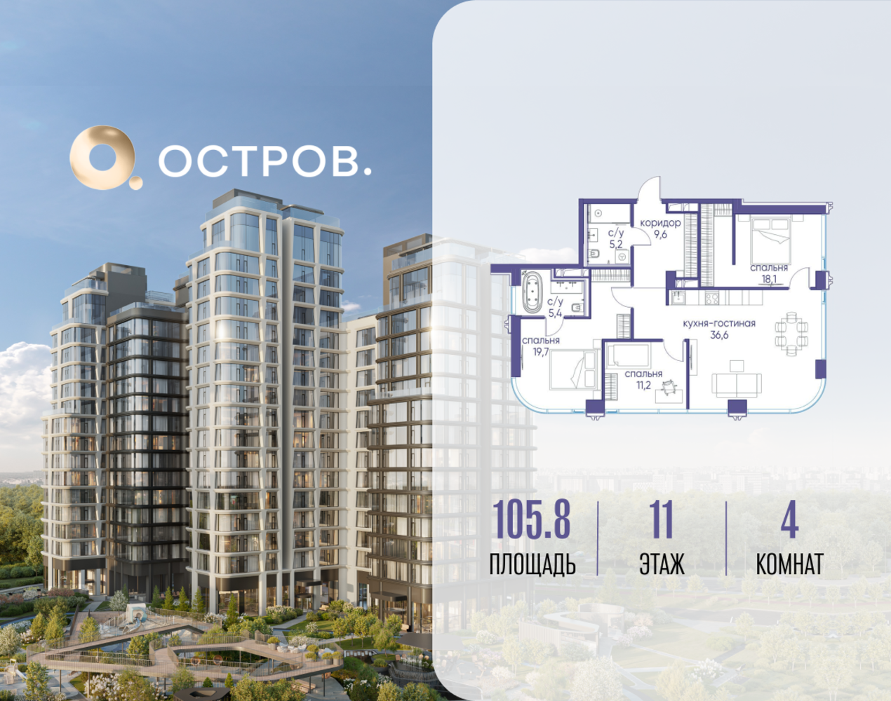 Продаётся 4-комн. квартира от застройщика: общая площадь 105.82 м², жилая 49.00 м², кухня 36.60 м², 11-й этаж, жилой квартал «Остров 12», корпус 1 (секция 3). Срок сдачи: 1 квартал 2029 года. 2 совмещенных санузла. В жилой зоне 2 больших окна на одну сторону, хорошая инсоляция. Позвоните сейчас и забронируйте квартиру! ОСТРОВ от Донстрой — жилой комплекс на западе Москвы, в Мневниковской пойме. Уникальное преимущество комплекса — в том, что он обособлен от города рекой и природным парком (650 га). Благодаря природному окружению эта территория имеет лучший экологический рейтинг в столице. Кварталы ОСТРОВА объединены ландшафтным дизайном в единое пространство — с набережными и Центральным бульваром. На ОСТРОВЕ любые объекты, необходимые для полноценной жизни и отдыха, находятся на расстоянии 15-минутной прогулки. Торговый центр и супермаркеты, кафе и рестораны, фитнес, салоны красоты, школы и детские сады. А также крупнейший в Москве спортивный кластер.