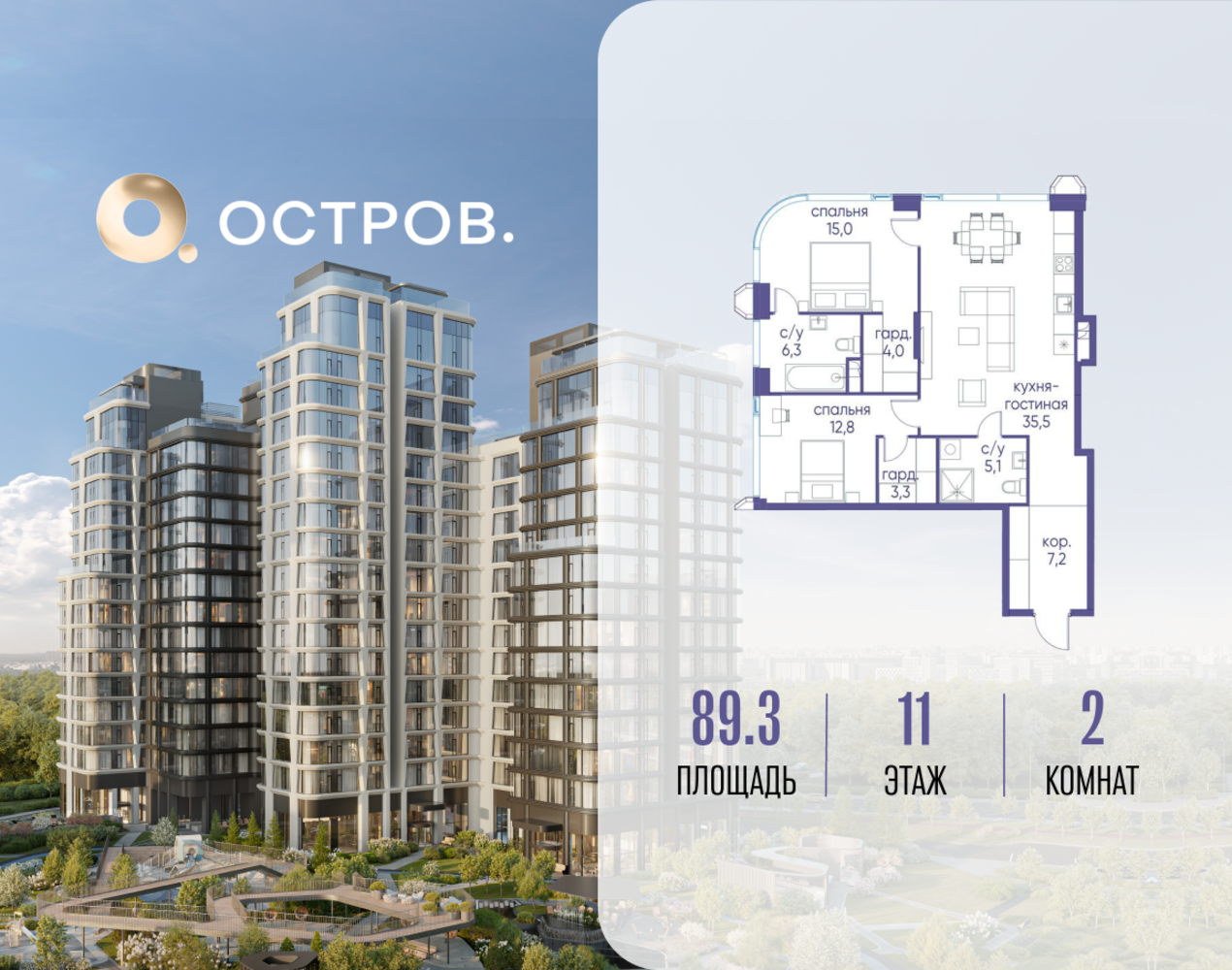 Продаётся 2-комн. квартира от застройщика: общая площадь 89.32 м², жилая 27.80 м², кухня 35.50 м², 11-й этаж, жилой квартал «Остров 12», корпус 1 (секция 2). Срок сдачи: 1 квартал 2029 года. 2 совмещенных санузла. В жилой зоне 2 больших окна на одну сторону, хорошая инсоляция. Позвоните сейчас и забронируйте квартиру! ОСТРОВ от Донстрой — жилой комплекс на западе Москвы, в Мневниковской пойме. Уникальное преимущество комплекса — в том, что он обособлен от города рекой и природным парком (650 га). Благодаря природному окружению эта территория имеет лучший экологический рейтинг в столице. Кварталы ОСТРОВА объединены ландшафтным дизайном в единое пространство — с набережными и Центральным бульваром. На ОСТРОВЕ любые объекты, необходимые для полноценной жизни и отдыха, находятся на расстоянии 15-минутной прогулки. Торговый центр и супермаркеты, кафе и рестораны, фитнес, салоны красоты, школы и детские сады. А также крупнейший в Москве спортивный кластер.