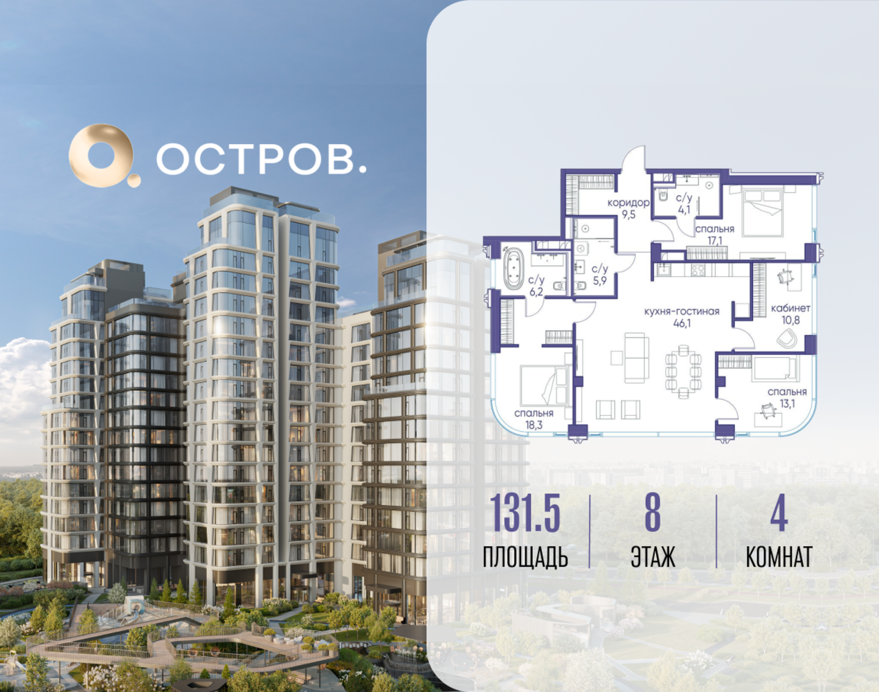 Продаётся 4-комн. квартира от застройщика: общая площадь 131.52 м², жилая 59.30 м², кухня 46.10 м², 8-й этаж, жилой квартал «Остров 12», корпус 1 (секция 3). Срок сдачи: 1 квартал 2029 года. 3 совмещенных санузла. В жилой зоне 2 больших окна на одну сторону, хорошая инсоляция. Позвоните сейчас и забронируйте квартиру! ОСТРОВ от Донстрой — жилой комплекс на западе Москвы, в Мневниковской пойме. Уникальное преимущество комплекса — в том, что он обособлен от города рекой и природным парком (650 га). Благодаря природному окружению эта территория имеет лучший экологический рейтинг в столице. Кварталы ОСТРОВА объединены ландшафтным дизайном в единое пространство — с набережными и Центральным бульваром. На ОСТРОВЕ любые объекты, необходимые для полноценной жизни и отдыха, находятся на расстоянии 15-минутной прогулки. Торговый центр и супермаркеты, кафе и рестораны, фитнес, салоны красоты, школы и детские сады. А также крупнейший в Москве спортивный кластер.