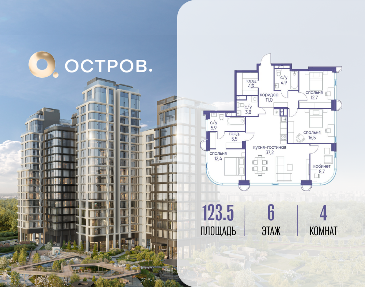 Продаётся 4-комн. квартира от застройщика: общая площадь 123.52 м², жилая 50.30 м², кухня 37.20 м², 6-й этаж, жилой квартал «Остров 12», корпус 1 (секция 2). Срок сдачи: 1 квартал 2029 года. 3 санузла (1 раздельный и 2 совмещенных). В жилой зоне 2 больших окна на одну сторону, хорошая инсоляция. Позвоните сейчас и забронируйте квартиру! ОСТРОВ от Донстрой — жилой комплекс на западе Москвы, в Мневниковской пойме. Уникальное преимущество комплекса — в том, что он обособлен от города рекой и природным парком (650 га). Благодаря природному окружению эта территория имеет лучший экологический рейтинг в столице. Кварталы ОСТРОВА объединены ландшафтным дизайном в единое пространство — с набережными и Центральным бульваром. На ОСТРОВЕ любые объекты, необходимые для полноценной жизни и отдыха, находятся на расстоянии 15-минутной прогулки. Торговый центр и супермаркеты, кафе и рестораны, фитнес, салоны красоты, школы и детские сады. А также крупнейший в Москве спортивный кластер.