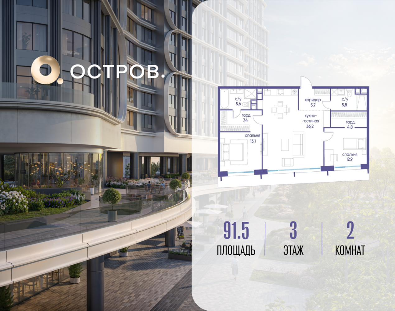 Скидка до 15% действует до 25.12.2025 г. при 100% оплате и не субсидированной ипотеке. Продаётся двухкомнатная квартира от застройщика: общая площадь 91.52 м², жилая 26.00 м², кухня 36.20 м², 3, жилой квартал «Остров 7», корпус 3 (7 квартал) (секция 1). срок сдачи: 4-кв. 2025. , 2 санузла: 2 совмещенных. В жилой зоне 2 больших окна на одну сторону, хорошая инсоляция. Позвоните сейчас и забронируйте квартиру! Купите квартиру в доме у прибрежного парка, в квартале ОСТРОВ.7. Это семь корпусов премиум- и бизнес-класса в одном из лучших мест ОСТРОВА - между бульваром и парком, поблизости от реки. Стильные корпуса имеют узнаваемый вид благодаря бионической пластике фасадов, приподнятых над землей. Для жителей предусмотрены детский клуб, фитнес-рум, коворкинг, переговорные, лаунжи. На крышах устроены видовые общественные пространства с зонами для отдыха и спорта. Двор расположен на двух уровнях: нижний ландшафтный парк и верхняя городская терраса. ОСТРОВ.7 - часть жилого комплекса на западе Москвы, в 15 минутах езды от центра. Это настоящий заповедник посреди большого города, в окружении реки и 650 га заповедников. Здесь все необходимое находится по соседству: от детского сада до супермаркета, от фитнес-зала до серфинг-центра. На территории созданы все условия для отдыха и общения: клубная инфраструктура в домах и дворы-парки, набережные и променады, маршруты для спортсменов, детей и возрастных жителей. В нескольких минутах ходьбы расположена станция метро "Терехово" БКЛ. На автомобиле - 10 минут до Москва-Сити и 15 минут до Садового кольца.