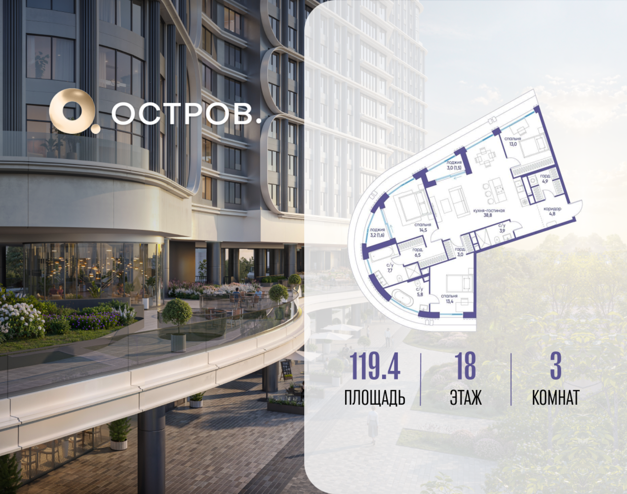 Скидка до 15% действует до 25.12.2025 г. при 100% оплате и не субсидированной ипотеке. Продаётся трехкомнатная квартира от застройщика: общая площадь 119.42 м², жилая 40.90 м², кухня 38.80 м², 18, жилой квартал «Остров 7», корпус 6 (7 квартал) (секция 2). срок сдачи: 4-кв. 2025. , 3 санузла: 3 совмещенных. В жилой зоне 2 больших окна на одну сторону, хорошая инсоляция. Позвоните сейчас и забронируйте квартиру! Купите квартиру в доме у прибрежного парка, в квартале ОСТРОВ.7. Это семь корпусов премиум- и бизнес-класса в одном из лучших мест ОСТРОВА - между бульваром и парком, поблизости от реки. Стильные корпуса имеют узнаваемый вид благодаря бионической пластике фасадов, приподнятых над землей. Для жителей предусмотрены детский клуб, фитнес-рум, коворкинг, переговорные, лаунжи. На крышах устроены видовые общественные пространства с зонами для отдыха и спорта. Двор расположен на двух уровнях: нижний ландшафтный парк и верхняя городская терраса. ОСТРОВ.7 - часть жилого комплекса на западе Москвы, в 15 минутах езды от центра. Это настоящий заповедник посреди большого города, в окружении реки и 650 га заповедников. Здесь все необходимое находится по соседству: от детского сада до супермаркета, от фитнес-зала до серфинг-центра. На территории созданы все условия для отдыха и общения: клубная инфраструктура в домах и дворы-парки, набережные и променады, маршруты для спортсменов, детей и возрастных жителей. В нескольких минутах ходьбы расположена станция метро "Терехово" БКЛ. На автомобиле - 10 минут до Москва-Сити и 15 минут до Садового кольца.