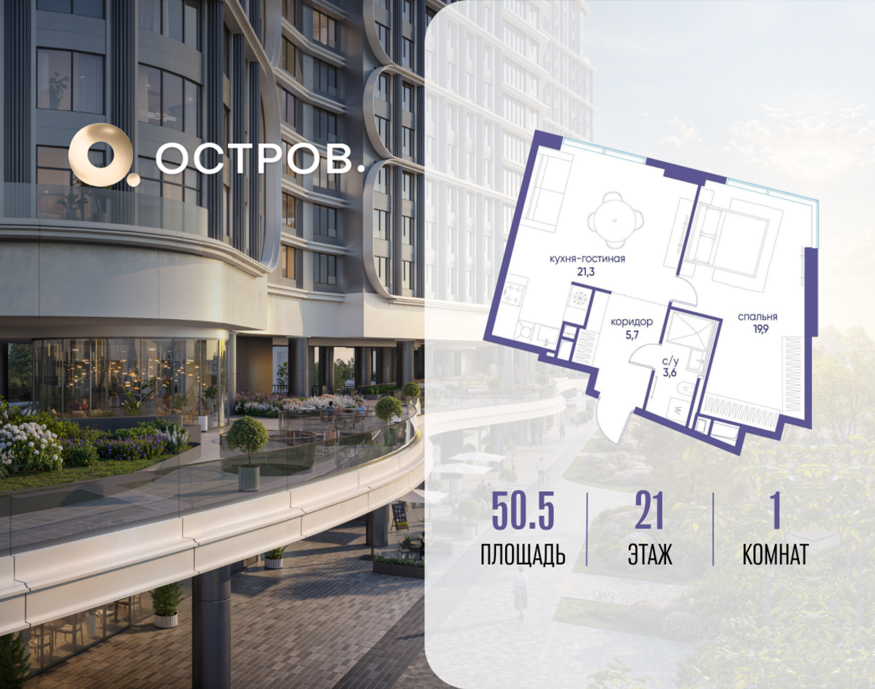 Продаётся однокомнатная квартира от застройщика: общая площадь 50.52 м², жилая 19.90 м², кухня 21.30 м², 21, жилой квартал «Остров 7», корпус 7 (7 квартал) (секция 1). срок сдачи: 4-кв. 2025. , 1 совмещенный санузел. В жилой зоне 2 больших окна на одну сторону, хорошая инсоляция. Позвоните сейчас и забронируйте квартиру! Купите квартиру в доме у прибрежного парка, в квартале ОСТРОВ.7. Это семь корпусов премиум- и бизнес-класса в одном из лучших мест ОСТРОВА - между бульваром и парком, поблизости от реки. Стильные корпуса имеют узнаваемый вид благодаря бионической пластике фасадов, приподнятых над землей. Для жителей предусмотрены детский клуб, фитнес-рум, коворкинг, переговорные, лаунжи. На крышах устроены видовые общественные пространства с зонами для отдыха и спорта. Двор расположен на двух уровнях: нижний ландшафтный парк и верхняя городская терраса. ОСТРОВ.7 - часть жилого комплекса на западе Москвы, в 15 минутах езды от центра. Это настоящий заповедник посреди большого города, в окружении реки и 650 га заповедников. Здесь все необходимое находится по соседству: от детского сада до супермаркета, от фитнес-зала до серфинг-центра. На территории созданы все условия для отдыха и общения: клубная инфраструктура в домах и дворы-парки, набережные и променады, маршруты для спортсменов, детей и возрастных жителей. В нескольких минутах ходьбы расположена станция метро "Терехово" БКЛ. На автомобиле - 10 минут до Москва-Сити и 15 минут до Садового кольца.