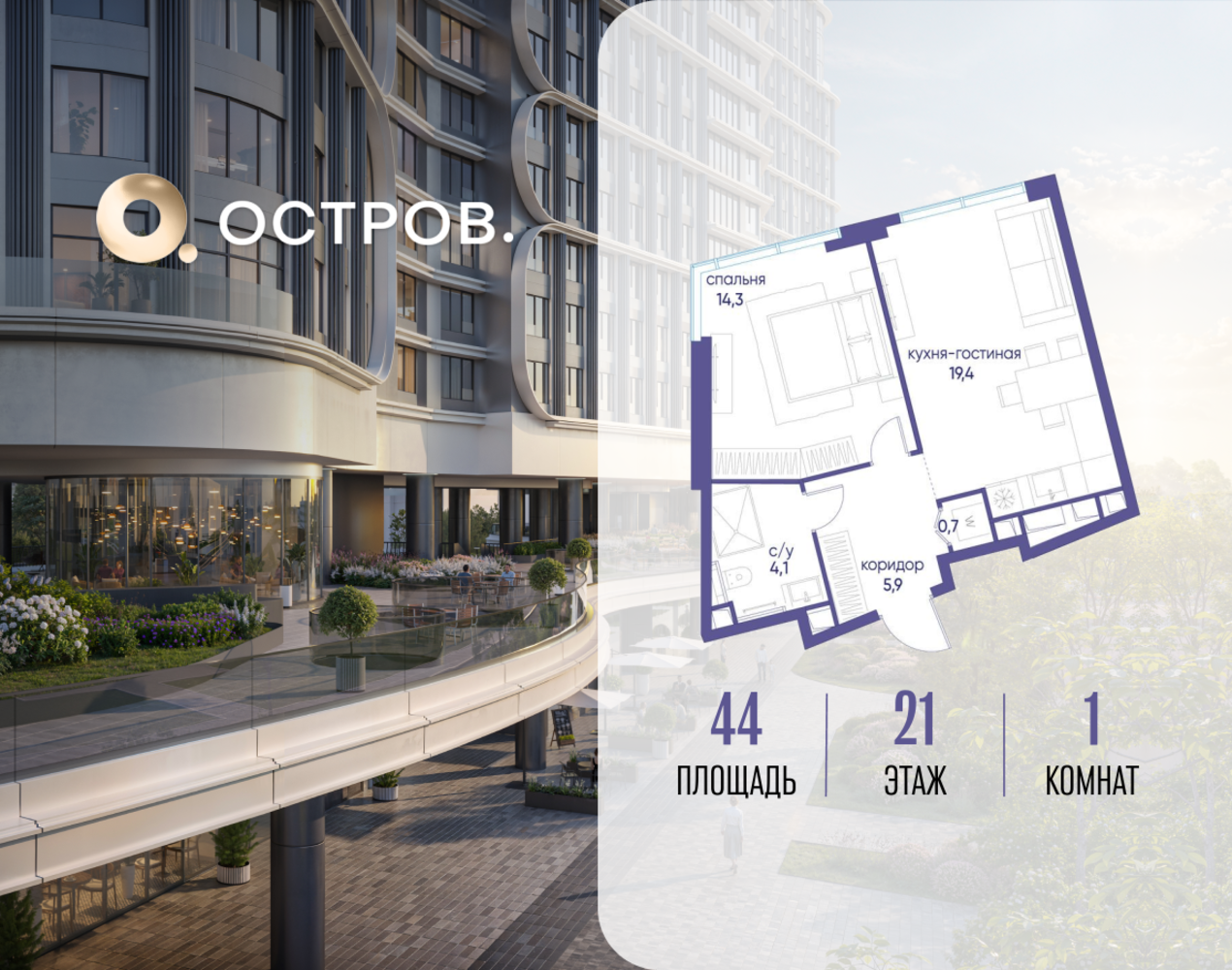 Продаётся однокомнатная квартира от застройщика: общая площадь 44.02 м², жилая 14.30 м², кухня 19.40 м², 21, жилой квартал «Остров 7», корпус 7 (7 квартал) (секция 1). срок сдачи: 4-кв. 2025. , 1 совмещенный санузел. В жилой зоне 2 больших окна на одну сторону, хорошая инсоляция. Позвоните сейчас и забронируйте квартиру! Купите квартиру в доме у прибрежного парка, в квартале ОСТРОВ.7. Это семь корпусов премиум- и бизнес-класса в одном из лучших мест ОСТРОВА - между бульваром и парком, поблизости от реки. Стильные корпуса имеют узнаваемый вид благодаря бионической пластике фасадов, приподнятых над землей. Для жителей предусмотрены детский клуб, фитнес-рум, коворкинг, переговорные, лаунжи. На крышах устроены видовые общественные пространства с зонами для отдыха и спорта. Двор расположен на двух уровнях: нижний ландшафтный парк и верхняя городская терраса. ОСТРОВ.7 - часть жилого комплекса на западе Москвы, в 15 минутах езды от центра. Это настоящий заповедник посреди большого города, в окружении реки и 650 га заповедников. Здесь все необходимое находится по соседству: от детского сада до супермаркета, от фитнес-зала до серфинг-центра. На территории созданы все условия для отдыха и общения: клубная инфраструктура в домах и дворы-парки, набережные и променады, маршруты для спортсменов, детей и возрастных жителей. В нескольких минутах ходьбы расположена станция метро "Терехово" БКЛ. На автомобиле - 10 минут до Москва-Сити и 15 минут до Садового кольца.