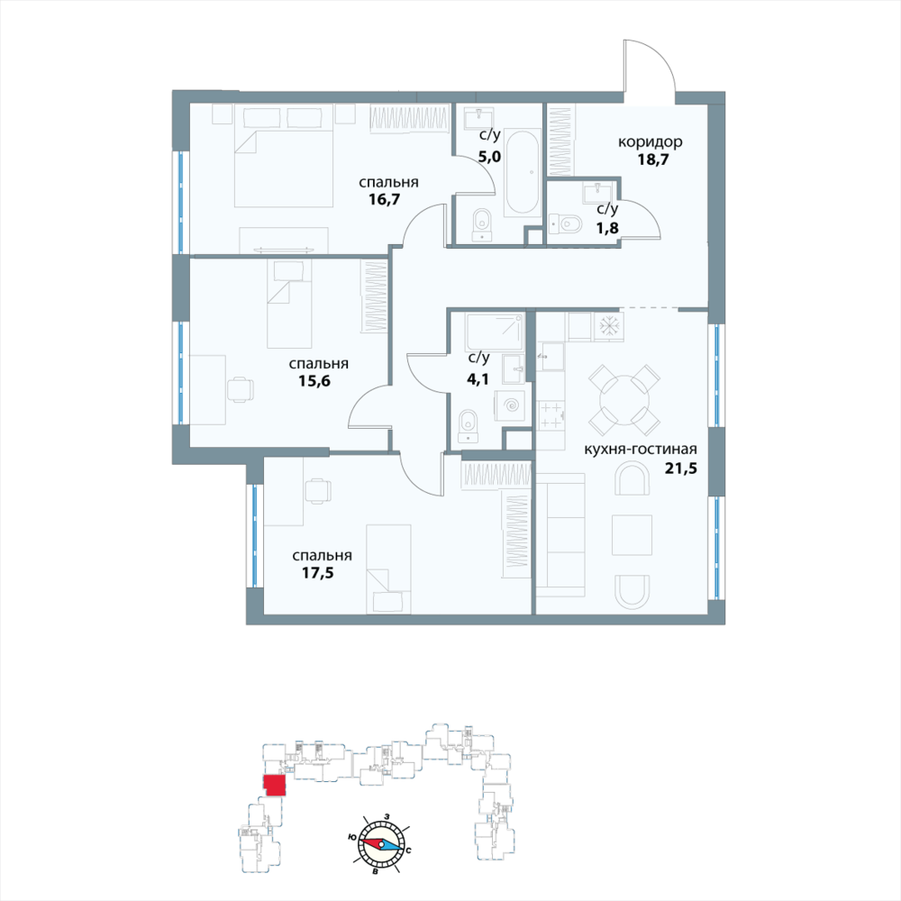 Новая трехкомнатная квартира в новостройке на 18-м этаже площадью 100.9 кв. м. Премиальный квартал в исторической локации и в трендовом месте, среди зелени парков на престижном западе Москвы, в 10 минутах от Воробьевых гор.