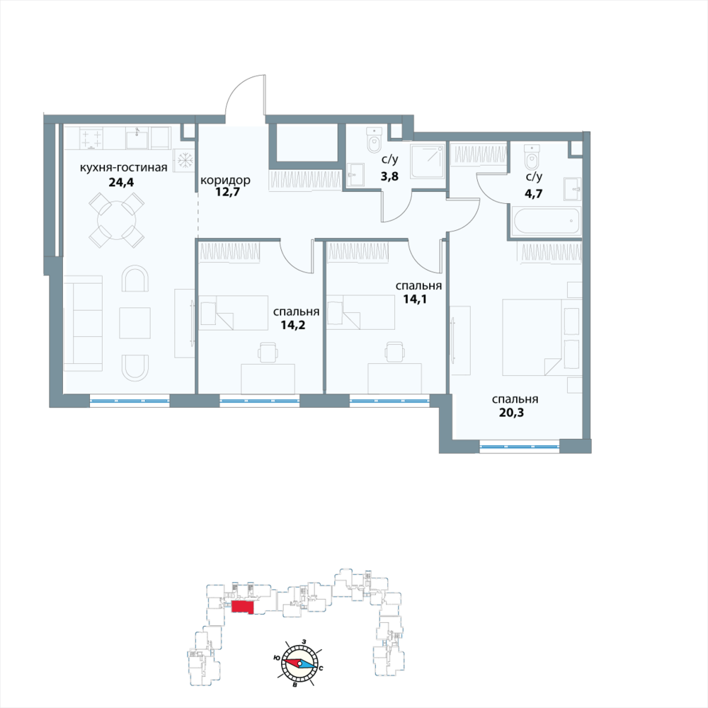 Новая трехкомнатная квартира в новостройке на 23-м этаже площадью 94.2 кв. м. Премиальный квартал в исторической локации и в трендовом месте, среди зелени парков на престижном западе Москвы, в 10 минутах от Воробьевых гор.