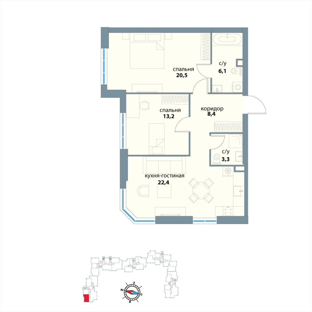 Новая двухкомнатная квартира в новостройке на 3-м этаже площадью 73.9 кв. м. Премиальный квартал в исторической локации и в трендовом месте, среди зелени парков на престижном западе Москвы, в 10 минутах от Воробьевых гор.