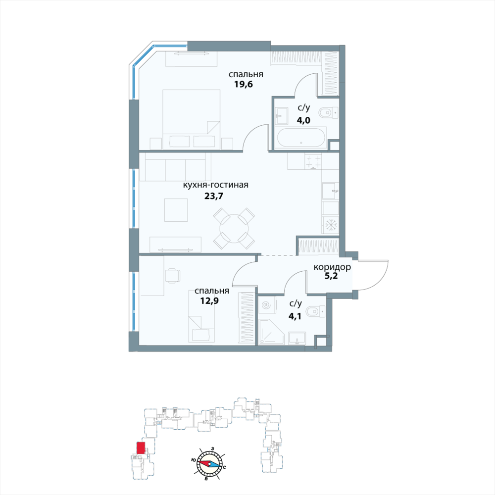 Новая двухкомнатная квартира в новостройке на 25-м этаже площадью 69.5 кв. м. Премиальный квартал в исторической локации и в трендовом месте, среди зелени парков на престижном западе Москвы, в 10 минутах от Воробьевых гор.