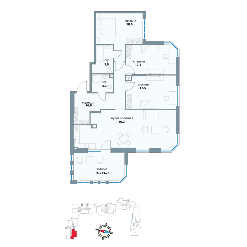Новая четырехкомнатная квартира в новостройке на 26-м этаже площадью 123.9 кв. м. Премиальный квартал в исторической локации и в трендовом месте, среди зелени парков на престижном западе Москвы, в 10 минутах от Воробьевых гор.