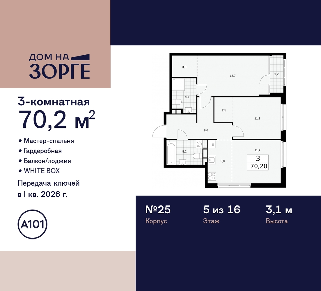 Продается трехкомнатная квартира с европланировкой и предчистовой отделкой в ЖК "Дом на Зорге" на 5 этаже. Общая площадь: 70.2 кв.м., жилая: 41 кв.м., суммарная площадь гостиной-столовой с кухонной зоной: 17.3 кв.м. Европланировка, кухня-гостиная - идеальный вариант для тех, кто любит часто принимать гостей. Квартира угловая, окна oбecпeчивaют paвнoмepнoe ocвeщeниe в тeчeниe дня. В квартире одна лоджия, два совмещенных санузла. Высота потолков 3.1 м. Имеется ниша под гардероб. Дом монолитный, двухподъездный, высотой 16 этажей. Квартира находится в 1-й секции в корпусе 25. На этаже 13 квартир. В подъезде 2 пассажирских и 1 грузовой лифт. Начало строительства - 2 квартал 2023 года. Окончание строительства - 1 квартал 2026 года. Оформление сделки по договору долевого участия. Артикул квартиры по базе застройщика 25К-25-43. В шаговой доступности от дома находятся станции метро (расстояние по прямой): «Зорге» (500 м), «Октябрьское поле» (800 м), «Панфиловская» (900 м), «Сокол» (1.6 км), «Хорошево» (1.6 км). "Дом на Зорге"» бизнес-класса возводится в престижном районе «Сокол» с исторической «сталинской» застройкой и статусными жилыми комплексами на границе с Хорошёвским районом Северо-Западного АО. До действующей станции метро (и МЦК) «Зорге» всего 350 метров. «Дом на Зорге» отличается элегантным и статусным внешним видом – идеально соответствует «дресс-коду» исторического окружения и в тоже время обращает на себя внимание. Вентилируемые фасады облицованы фиброцементными и керамогранитными панелями, которые повторяют фактуру натурального камня и бетона. Кондиционеры скроют корзины и стильные блоки, расположенные в декоративных элементах фасада. Мягкая архитектурно-художественная подсветка подчеркнёт благородный экстерьер дома. Сформированная инфраструктура района предоставит жителям богатый выбор мест для отдыха, шопинга и занятий спортом. На первом этаже «Дома на Зорге» откроются уютные магазины, атмосферные кафе и салоны красоты с отличным сервисом. Здесь предусмотрено всё для удобства, позитивного настроения и безопасности жителей. В закрытый двор не войдут посторонние. Автомобили останутся за периметром или в подземном паркинге. Две 16-этажных секции дома соединит лобби с дизайнерской отделкой. Оно станет стильным общественным пространством и главным входом для жителей, также ведущим в скрытый от посторонних глаз приватный внутренний двор. Всего в локации – более четырёх десятков разнообразных учебных учреждений для детей, включая легендарную «Курчатовскую школу». В шаговой доступности находятся корпуса школы № 1251 имени генерала Шарля де Голля – с дошкольным отделением. На территории дома будут благоустроены общий и приватный (доступный только жителям) дворы. Дизайн каждой функциональной зоны уникален, а вместе они подчёркивают благородный архитектурный стиль здания. В основе цветовых решений – «отражение» фасадов, мягкие природные оттенки. (AQID02221015)