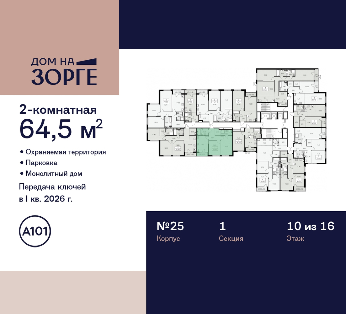 Двухкомнатная квартира от застройщика с предчистовой отделкой в ЖК "Дом на Зорге" на 10 этаже. Общая площадь: 64.5 кв.м., жилая: 29.4 кв.м., площадь просторной кухни-столовой: 13.6 кв.м. Комнаты изолированные, все окна выходят на одну сторону. В квартире одна лоджия, два совмещенных санузла. Высота потолков 3.1 м. Имеется ниша под гардероб. Дом монолитный, двухподъездный, высотой 16 этажей. Квартира находится в 1-й секции в корпусе 25. На этаже 13 квартир. В подъезде 2 пассажирских и 1 грузовой лифт. Начало строительства - 2 квартал 2023 года. Окончание строительства - 1 квартал 2026 года. Оформление сделки по договору долевого участия. Артикул квартиры по базе застройщика 25К-25-112. В шаговой доступности от дома находятся станции метро (расстояние по прямой): «Зорге» (500 м), «Октябрьское поле» (800 м), «Панфиловская» (900 м), «Сокол» (1.6 км), «Хорошево» (1.6 км). ПРЕДЛОЖЕНИЯ ОТ ЗАСТРОЙЩИКА В ОКТЯБРЕ 2025: Ипотека от 13,9 % для всех! На весь срок. "Семейная ипотека" вернулась. Ставка от 3,5 % на весь срок! Без удорожания! Выгодное ипотечное комбо: Ипотека от 2200 р./мес. и от 6 % после рождения ребёнка! Ипотека для всех "Держи пять!" - ставка 5 % на 2 года! *более подробную информацию по скидкам и акциям уточняйте в отделе продаж "Дом на Зорге"» бизнес-класса возводится в престижном районе «Сокол» с исторической «сталинской» застройкой и статусными жилыми комплексами на границе с Хорошёвским районом Северо-Западного АО. До действующей станции метро (и МЦК) «Зорге» всего 350 метров. «Дом на Зорге» отличается элегантным и статусным внешним видом – идеально соответствует «дресс-коду» исторического окружения и в тоже время обращает на себя внимание. Вентилируемые фасады облицованы фиброцементными и керамогранитными панелями, которые повторяют фактуру натурального камня и бетона. Кондиционеры скроют корзины и стильные блоки, расположенные в декоративных элементах фасада. Мягкая архитектурно-художественная подсветка подчеркнёт благородный экстерьер дома. Сформированная инфраструктура района предоставит жителям богатый выбор мест для отдыха, шопинга и занятий спортом. На первом этаже «Дома на Зорге» откроются уютные магазины, атмосферные кафе и салоны красоты с отличным сервисом. Здесь предусмотрено всё для удобства, позитивного настроения и безопасности жителей. В закрытый двор не войдут посторонние. Автомобили останутся за периметром или в подземном паркинге. Две 16-этажных секции дома соединит лобби с дизайнерской отделкой. Оно станет стильным общественным пространством и главным входом для жителей, также ведущим в скрытый от посторонних глаз приватный внутренний двор. Всего в локации – более четырёх десятков разнообразных учебных учреждений для детей, включая легендарную «Курчатовскую школу». В шаговой доступности находятся корпуса школы № 1251 имени генерала Шарля де Голля – с дошкольным отделением. На территории дома будут благоустроены общий и приватный (доступный только жителям) дворы. Дизайн каждой функциональной зоны уникален, а вместе они подчёркивают благородный архитектурный стиль здания. В основе цветовых решений – «отражение» фасадов, мягкие природные оттенки. (AQID02221081)