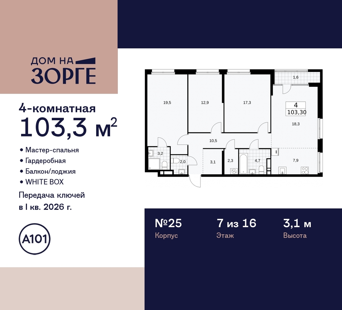 Четырехкомнатная квартира с европланировкой и предчистовой отделкой в ЖК "Дом на Зорге" на 7 этаже. Общая площадь: 103.3 кв.м., жилая: 68 кв.м., общая площадь гостиной-столовой с кухонной зоной: 26.2 кв.м. Европланировка, за счет большой площади кухни-гостиной квартира выглядит просторной и очень удобна для жизни. Квартира угловая, очень светлая, естественная вентиляция при открытии окон. В квартире одна лоджия, два совмещенных и один раздельный санузел. Высота потолков 3.1 м. Имеется ниша под гардероб. Дом монолитный, двухподъездный, высотой 16 этажей. Квартира находится во 2-й секции в корпусе 25. На этаже 8 квартир. В подъезде 1 пассажирский и 1 грузовой лифт. Начало строительства - 2 квартал 2023 года. Окончание строительства - 1 квартал 2026 года. Оформление сделки по договору долевого участия. Артикул квартиры по базе застройщика 25К-25-237. В шаговой доступности от дома расположены станции метро (расстояние по прямой): «Зорге» (500 м), «Октябрьское поле» (800 м), «Панфиловская» (900 м), «Сокол» (1.6 км), «Хорошево» (1.6 км). ПРЕДЛОЖЕНИЯ ОТ ЗАСТРОЙЩИКА В ОКТЯБРЕ 2025: Ипотека от 13,9 % для всех! На весь срок. "Семейная ипотека" вернулась. Ставка от 3,5 % на весь срок! Без удорожания! Выгодное ипотечное комбо: Ипотека от 2200 р./мес. и от 6 % после рождения ребёнка! Ипотека для всех "Держи пять!" - ставка 5 % на 2 года! *более подробную информацию по скидкам и акциям уточняйте в отделе продаж "Дом на Зорге"» бизнес-класса возводится в престижном районе «Сокол» с исторической «сталинской» застройкой и статусными жилыми комплексами на границе с Хорошёвским районом Северо-Западного АО. До действующей станции метро (и МЦК) «Зорге» всего 350 метров. «Дом на Зорге» отличается элегантным и статусным внешним видом – идеально соответствует «дресс-коду» исторического окружения и в тоже время обращает на себя внимание. Вентилируемые фасады облицованы фиброцементными и керамогранитными панелями, которые повторяют фактуру натурального камня и бетона. Кондиционеры скроют корзины и стильные блоки, расположенные в декоративных элементах фасада. Мягкая архитектурно-художественная подсветка подчеркнёт благородный экстерьер дома. Сформированная инфраструктура района предоставит жителям богатый выбор мест для отдыха, шопинга и занятий спортом. На первом этаже «Дома на Зорге» откроются уютные магазины, атмосферные кафе и салоны красоты с отличным сервисом. Здесь предусмотрено всё для удобства, позитивного настроения и безопасности жителей. В закрытый двор не войдут посторонние. Автомобили останутся за периметром или в подземном паркинге. Две 16-этажных секции дома соединит лобби с дизайнерской отделкой. Оно станет стильным общественным пространством и главным входом для жителей, также ведущим в скрытый от посторонних глаз приватный внутренний двор. Всего в локации – более четырёх десятков разнообразных учебных учреждений для детей, включая легендарную «Курчатовскую школу». В шаговой доступности находятся корпуса школы № 1251 имени генерала Шарля де Голля – с дошкольным отделением. На территории дома будут благоустроены общий и приватный (доступный только жителям) дворы. Дизайн каждой функциональной зоны уникален, а вместе они подчёркивают благородный архитектурный стиль здания. В основе цветовых решений – «отражение» фасадов, мягкие природные оттенки. (AQID02221192)