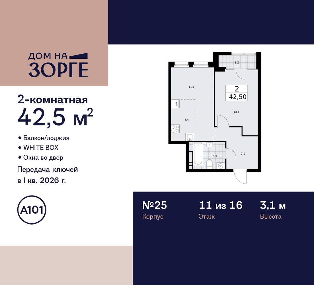 Просторная двухкомнатная квартира с европланировкой и предчистовой отделкой в ЖК "Дом на Зорге" на 11 этаже. Общая площадь: 42.5 кв.м., жилая: 24.2 кв.м., суммарная площадь гостиной-столовой с кухонной зоной: 16.5 кв.м. Европейская планировка, в просторной кухне-гостиной удобно как готовить, так и отдыхать. Комнаты изолированные, все окна выходят на одну сторону. В квартире одна лоджия, один совмещенный санузел. Высота потолков 3.1 м. Дом монолитный, двухподъездный, высотой 16 этажей. Квартира находится во 2-й секции в корпусе 25. На этаже 8 квартир. В подъезде 1 пассажирский и 1 грузовой лифт. Начало строительства - 2 квартал 2023 года. Окончание строительства - 1 квартал 2026 года. Оформление сделки по договору долевого участия. Артикул квартиры по базе застройщика 25К-25-268. В шаговой доступности от дома находятся станции метро (расстояние по прямой): «Зорге» (500 м), «Октябрьское поле» (800 м), «Панфиловская» (900 м), «Сокол» (1.6 км), «Хорошево» (1.6 км). ПРЕДЛОЖЕНИЯ ОТ ЗАСТРОЙЩИКА В ОКТЯБРЕ 2025: Ипотека от 13,9 % для всех! На весь срок. "Семейная ипотека" вернулась. Ставка от 3,5 % на весь срок! Без удорожания! Выгодное ипотечное комбо: Ипотека от 2200 р./мес. и от 6 % после рождения ребёнка! Ипотека для всех "Держи пять!" - ставка 5 % на 2 года! *более подробную информацию по скидкам и акциям уточняйте в отделе продаж "Дом на Зорге"» бизнес-класса возводится в престижном районе «Сокол» с исторической «сталинской» застройкой и статусными жилыми комплексами на границе с Хорошёвским районом Северо-Западного АО. До действующей станции метро (и МЦК) «Зорге» всего 350 метров. «Дом на Зорге» отличается элегантным и статусным внешним видом – идеально соответствует «дресс-коду» исторического окружения и в тоже время обращает на себя внимание. Вентилируемые фасады облицованы фиброцементными и керамогранитными панелями, которые повторяют фактуру натурального камня и бетона. Кондиционеры скроют корзины и стильные блоки, расположенные в декоративных элементах фасада. Мягкая архитектурно-художественная подсветка подчеркнёт благородный экстерьер дома. Сформированная инфраструктура района предоставит жителям богатый выбор мест для отдыха, шопинга и занятий спортом. На первом этаже «Дома на Зорге» откроются уютные магазины, атмосферные кафе и салоны красоты с отличным сервисом. Здесь предусмотрено всё для удобства, позитивного настроения и безопасности жителей. В закрытый двор не войдут посторонние. Автомобили останутся за периметром или в подземном паркинге. Две 16-этажных секции дома соединит лобби с дизайнерской отделкой. Оно станет стильным общественным пространством и главным входом для жителей, также ведущим в скрытый от посторонних глаз приватный внутренний двор. Всего в локации – более четырёх десятков разнообразных учебных учреждений для детей, включая легендарную «Курчатовскую школу». В шаговой доступности находятся корпуса школы № 1251 имени генерала Шарля де Голля – с дошкольным отделением. На территории дома будут благоустроены общий и приватный (доступный только жителям) дворы. Дизайн каждой функциональной зоны уникален, а вместе они подчёркивают благородный архитектурный стиль здания. В основе цветовых решений – «отражение» фасадов, мягкие природные оттенки. (AQID02221216)