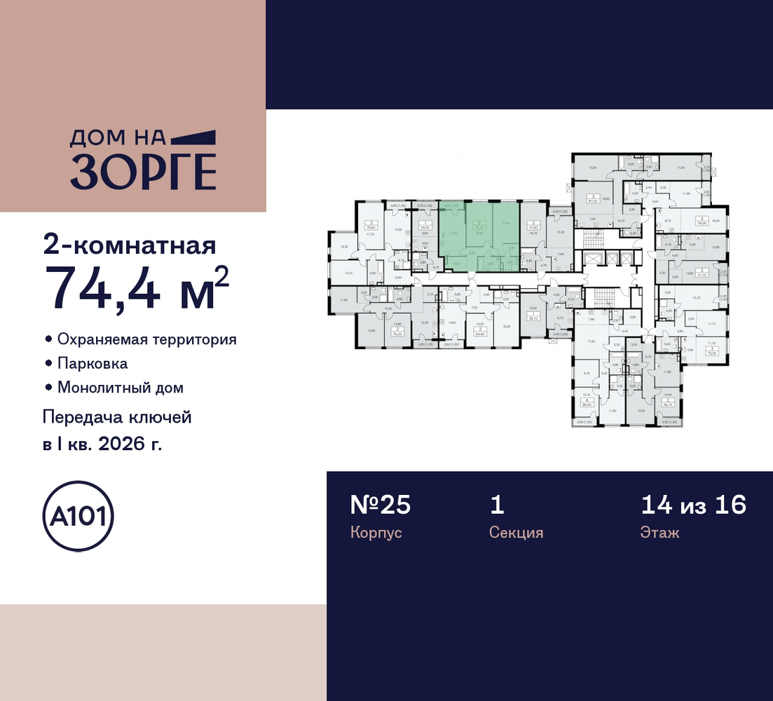 Просторная 2-комн. квартира с предчистовой отделкой в ЖК "Дом на Зорге" на 14 этаже. Общая площадь: 74.4 кв.м., жилая: 34.2 кв.м., площадь просторной кухни-столовой: 17.5 кв.м. Комнаты изолированные, все окна выходят на одну сторону. В квартире одна лоджия, два совмещенных санузла. Высота потолков 3.1 м. Имеется ниша под гардероб. Дом монолитный, двухподъездный, высотой 16 этажей. Квартира находится в 1-й секции в корпусе 25. На этаже 13 квартир. В подъезде 2 пассажирских и 1 грузовой лифт. Начало строительства - 2 квартал 2023 года. Окончание строительства - 1 квартал 2026 года. Оформление сделки по договору долевого участия. Артикул квартиры по базе застройщика 25К-25-168. В шаговой доступности от дома расположены станции метро (расстояние по прямой): «Зорге» (500 м), «Октябрьское поле» (800 м), «Панфиловская» (900 м), «Сокол» (1.6 км), «Хорошево» (1.6 км). "Дом на Зорге"» бизнес-класса возводится в престижном районе «Сокол» с исторической «сталинской» застройкой и статусными жилыми комплексами на границе с Хорошёвским районом Северо-Западного АО. До действующей станции метро (и МЦК) «Зорге» всего 350 метров. «Дом на Зорге» отличается элегантным и статусным внешним видом – идеально соответствует «дресс-коду» исторического окружения и в тоже время обращает на себя внимание. Вентилируемые фасады облицованы фиброцементными и керамогранитными панелями, которые повторяют фактуру натурального камня и бетона. Кондиционеры скроют корзины и стильные блоки, расположенные в декоративных элементах фасада. Мягкая архитектурно-художественная подсветка подчеркнёт благородный экстерьер дома. Сформированная инфраструктура района предоставит жителям богатый выбор мест для отдыха, шопинга и занятий спортом. На первом этаже «Дома на Зорге» откроются уютные магазины, атмосферные кафе и салоны красоты с отличным сервисом. Здесь предусмотрено всё для удобства, позитивного настроения и безопасности жителей. В закрытый двор не войдут посторонние. Автомобили останутся за периметром или в подземном паркинге. Две 16-этажных секции дома соединит лобби с дизайнерской отделкой. Оно станет стильным общественным пространством и главным входом для жителей, также ведущим в скрытый от посторонних глаз приватный внутренний двор. Всего в локации – более четырёх десятков разнообразных учебных учреждений для детей, включая легендарную «Курчатовскую школу». В шаговой доступности находятся корпуса школы № 1251 имени генерала Шарля де Голля – с дошкольным отделением. На территории дома будут благоустроены общий и приватный (доступный только жителям) дворы. Дизайн каждой функциональной зоны уникален, а вместе они подчёркивают благородный архитектурный стиль здания. В основе цветовых решений – «отражение» фасадов, мягкие природные оттенки. (AQID02221134)
