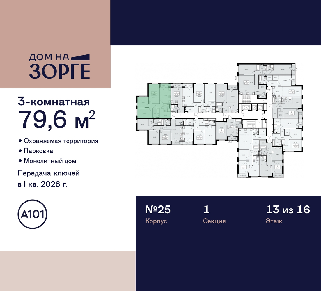 Просторная 3-комн. квартира с предчистовой отделкой в ЖК "Дом на Зорге" на 13 этаже. Общая площадь: 79.6 кв.м., жилая: 41.1 кв.м., площадь просторной кухни-столовой: 14.9 кв.м. Квартира угловая, идеально подойдет любителям тишины и панорамных видов. В квартире одна лоджия, два совмещенных санузла. Высота потолков 3.1 м. Дом монолитный, двухподъездный, высотой 16 этажей. Квартира находится в 1-й секции в корпусе 25. На этаже 13 квартир. В подъезде 2 пассажирских и 1 грузовой лифт. Начало строительства - 2 квартал 2023 года. Окончание строительства - 1 квартал 2026 года. Оформление сделки по договору долевого участия. Артикул квартиры по базе застройщика 25К-25-153. В шаговой доступности от дома расположены станции метро (расстояние по прямой): «Зорге» (500 м), «Октябрьское поле» (800 м), «Панфиловская» (900 м), «Сокол» (1.6 км), «Хорошево» (1.6 км). ПРЕДЛОЖЕНИЯ ОТ ЗАСТРОЙЩИКА В ОКТЯБРЕ 2025: Ипотека от 13,9 % для всех! На весь срок. "Семейная ипотека" вернулась. Ставка от 3,5 % на весь срок! Без удорожания! Выгодное ипотечное комбо: Ипотека от 2200 р./мес. и от 6 % после рождения ребёнка! Ипотека для всех "Держи пять!" - ставка 5 % на 2 года! *более подробную информацию по скидкам и акциям уточняйте в отделе продаж "Дом на Зорге"» бизнес-класса возводится в престижном районе «Сокол» с исторической «сталинской» застройкой и статусными жилыми комплексами на границе с Хорошёвским районом Северо-Западного АО. До действующей станции метро (и МЦК) «Зорге» всего 350 метров. «Дом на Зорге» отличается элегантным и статусным внешним видом – идеально соответствует «дресс-коду» исторического окружения и в тоже время обращает на себя внимание. Вентилируемые фасады облицованы фиброцементными и керамогранитными панелями, которые повторяют фактуру натурального камня и бетона. Кондиционеры скроют корзины и стильные блоки, расположенные в декоративных элементах фасада. Мягкая архитектурно-художественная подсветка подчеркнёт благородный экстерьер дома. Сформированная инфраструктура района предоставит жителям богатый выбор мест для отдыха, шопинга и занятий спортом. На первом этаже «Дома на Зорге» откроются уютные магазины, атмосферные кафе и салоны красоты с отличным сервисом. Здесь предусмотрено всё для удобства, позитивного настроения и безопасности жителей. В закрытый двор не войдут посторонние. Автомобили останутся за периметром или в подземном паркинге. Две 16-этажных секции дома соединит лобби с дизайнерской отделкой. Оно станет стильным общественным пространством и главным входом для жителей, также ведущим в скрытый от посторонних глаз приватный внутренний двор. Всего в локации – более четырёх десятков разнообразных учебных учреждений для детей, включая легендарную «Курчатовскую школу». В шаговой доступности находятся корпуса школы № 1251 имени генерала Шарля де Голля – с дошкольным отделением. На территории дома будут благоустроены общий и приватный (доступный только жителям) дворы. Дизайн каждой функциональной зоны уникален, а вместе они подчёркивают благородный архитектурный стиль здания. В основе цветовых решений – «отражение» фасадов, мягкие природные оттенки. (AQID02221119)