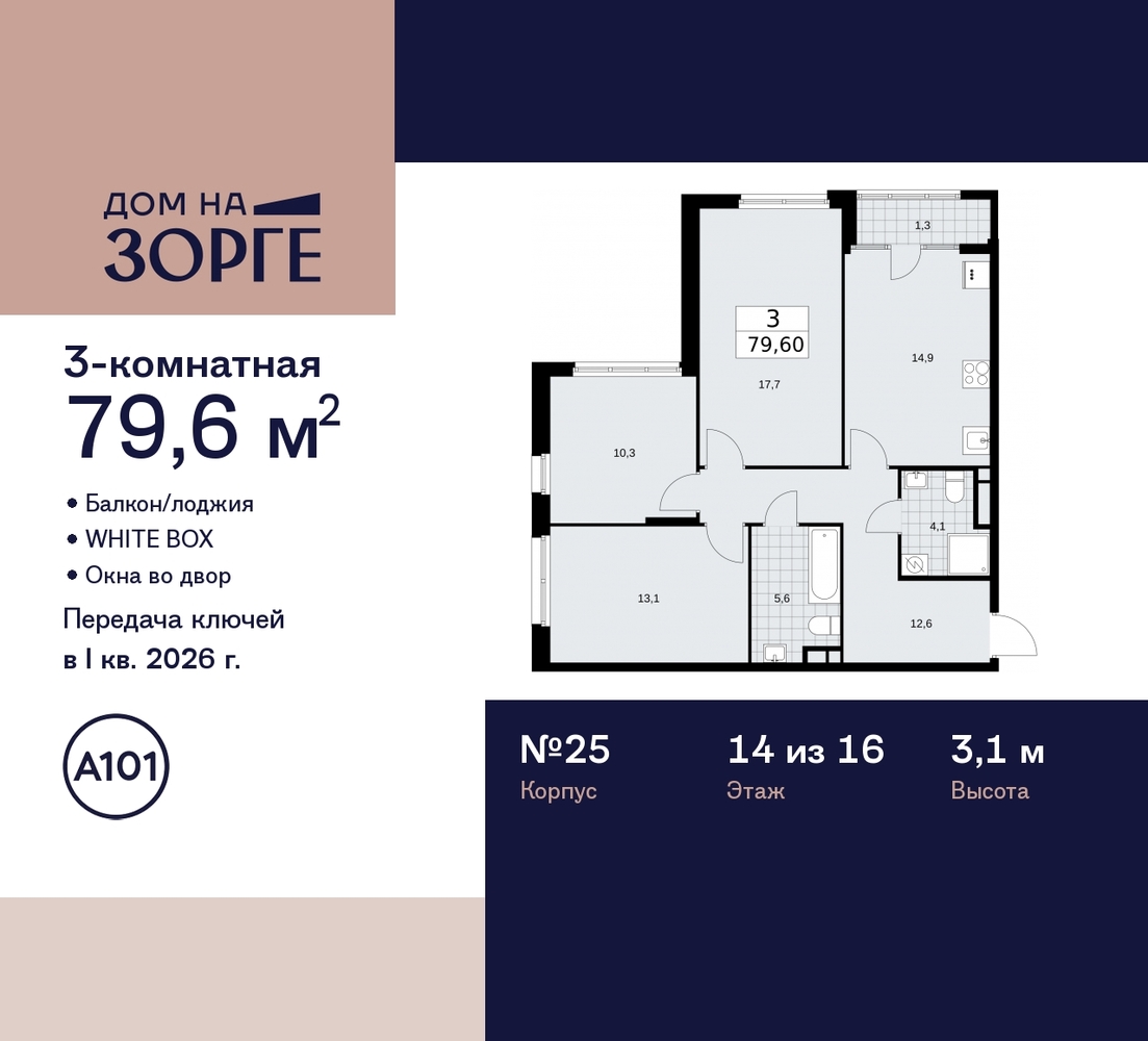 Трехкомнатная квартира с предчистовой отделкой в ЖК "Дом на Зорге" на 14 этаже. Общая площадь: 79.6 кв.м., жилая: 41.1 кв.м., площадь просторной кухни-столовой: 14.9 кв.м. Квартира угловая, очень светлая, естественная вентиляция при открытии окон. В квартире одна лоджия, два совмещенных санузла. Высота потолков 3.1 м. Дом монолитный, двухподъездный, высотой 16 этажей. Квартира находится в 1-й секции в корпусе 25. На этаже 13 квартир. В подъезде 2 пассажирских и 1 грузовой лифт. Начало строительства - 2 квартал 2023 года. Окончание строительства - 1 квартал 2026 года. Оформление сделки по договору долевого участия. Артикул квартиры по базе застройщика 25К-25-166. В шаговой доступности от дома имеются станции метро (расстояние по прямой): «Зорге» (500 м), «Октябрьское поле» (800 м), «Панфиловская» (900 м), «Сокол» (1.6 км), «Хорошево» (1.6 км). ПРЕДЛОЖЕНИЯ ОТ ЗАСТРОЙЩИКА В ОКТЯБРЕ 2025: Ипотека от 13,9 % для всех! На весь срок. "Семейная ипотека" вернулась. Ставка от 3,5 % на весь срок! Без удорожания! Выгодное ипотечное комбо: Ипотека от 2200 р./мес. и от 6 % после рождения ребёнка! Ипотека для всех "Держи пять!" - ставка 5 % на 2 года! *более подробную информацию по скидкам и акциям уточняйте в отделе продаж "Дом на Зорге"» бизнес-класса возводится в престижном районе «Сокол» с исторической «сталинской» застройкой и статусными жилыми комплексами на границе с Хорошёвским районом Северо-Западного АО. До действующей станции метро (и МЦК) «Зорге» всего 350 метров. «Дом на Зорге» отличается элегантным и статусным внешним видом – идеально соответствует «дресс-коду» исторического окружения и в тоже время обращает на себя внимание. Вентилируемые фасады облицованы фиброцементными и керамогранитными панелями, которые повторяют фактуру натурального камня и бетона. Кондиционеры скроют корзины и стильные блоки, расположенные в декоративных элементах фасада. Мягкая архитектурно-художественная подсветка подчеркнёт благородный экстерьер дома. Сформированная инфраструктура района предоставит жителям богатый выбор мест для отдыха, шопинга и занятий спортом. На первом этаже «Дома на Зорге» откроются уютные магазины, атмосферные кафе и салоны красоты с отличным сервисом. Здесь предусмотрено всё для удобства, позитивного настроения и безопасности жителей. В закрытый двор не войдут посторонние. Автомобили останутся за периметром или в подземном паркинге. Две 16-этажных секции дома соединит лобби с дизайнерской отделкой. Оно станет стильным общественным пространством и главным входом для жителей, также ведущим в скрытый от посторонних глаз приватный внутренний двор. Всего в локации – более четырёх десятков разнообразных учебных учреждений для детей, включая легендарную «Курчатовскую школу». В шаговой доступности находятся корпуса школы № 1251 имени генерала Шарля де Голля – с дошкольным отделением. На территории дома будут благоустроены общий и приватный (доступный только жителям) дворы. Дизайн каждой функциональной зоны уникален, а вместе они подчёркивают благородный архитектурный стиль здания. В основе цветовых решений – «отражение» фасадов, мягкие природные оттенки. (AQID02221132)