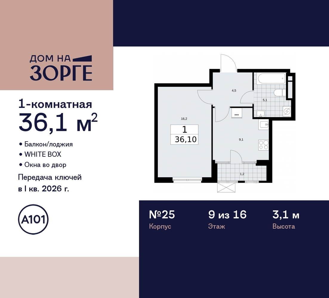 Однокомнатная квартира от застройщика с предчистовой отделкой в ЖК "Дом на Зорге" на 9 этаже. Общая площадь: 36.1 кв.м., жилая: 16.2 кв.м., площадь просторной кухни-столовой: 9.1 кв.м. Все окна выходят на одну сторону. В квартире одна лоджия, один совмещенный санузел. Высота потолков 3.1 м. Дом монолитный, двухподъездный, высотой 16 этажей. Квартира находится в 1-й секции в корпусе 25. На этаже 13 квартир. В подъезде 2 пассажирских и 1 грузовой лифт. Начало строительства - 2 квартал 2023 года. Окончание строительства - 1 квартал 2026 года. Оформление сделки по договору долевого участия. Артикул квартиры по базе застройщика 25К-25-98. В шаговой доступности от дома находятся станции метро (расстояние по прямой): «Зорге» (500 м), «Октябрьское поле» (800 м), «Панфиловская» (900 м), «Сокол» (1.6 км), «Хорошево» (1.6 км). ПРЕДЛОЖЕНИЯ ОТ ЗАСТРОЙЩИКА В ОКТЯБРЕ 2025: Ипотека от 13,9 % для всех! На весь срок. "Семейная ипотека" вернулась. Ставка от 3,5 % на весь срок! Без удорожания! Выгодное ипотечное комбо: Ипотека от 2200 р./мес. и от 6 % после рождения ребёнка! Ипотека для всех "Держи пять!" - ставка 5 % на 2 года! *более подробную информацию по скидкам и акциям уточняйте в отделе продаж "Дом на Зорге"» бизнес-класса возводится в престижном районе «Сокол» с исторической «сталинской» застройкой и статусными жилыми комплексами на границе с Хорошёвским районом Северо-Западного АО. До действующей станции метро (и МЦК) «Зорге» всего 350 метров. «Дом на Зорге» отличается элегантным и статусным внешним видом – идеально соответствует «дресс-коду» исторического окружения и в тоже время обращает на себя внимание. Вентилируемые фасады облицованы фиброцементными и керамогранитными панелями, которые повторяют фактуру натурального камня и бетона. Кондиционеры скроют корзины и стильные блоки, расположенные в декоративных элементах фасада. Мягкая архитектурно-художественная подсветка подчеркнёт благородный экстерьер дома. Сформированная инфраструктура района предоставит жителям богатый выбор мест для отдыха, шопинга и занятий спортом. На первом этаже «Дома на Зорге» откроются уютные магазины, атмосферные кафе и салоны красоты с отличным сервисом. Здесь предусмотрено всё для удобства, позитивного настроения и безопасности жителей. В закрытый двор не войдут посторонние. Автомобили останутся за периметром или в подземном паркинге. Две 16-этажных секции дома соединит лобби с дизайнерской отделкой. Оно станет стильным общественным пространством и главным входом для жителей, также ведущим в скрытый от посторонних глаз приватный внутренний двор. Всего в локации – более четырёх десятков разнообразных учебных учреждений для детей, включая легендарную «Курчатовскую школу». В шаговой доступности находятся корпуса школы № 1251 имени генерала Шарля де Голля – с дошкольным отделением. На территории дома будут благоустроены общий и приватный (доступный только жителям) дворы. Дизайн каждой функциональной зоны уникален, а вместе они подчёркивают благородный архитектурный стиль здания. В основе цветовых решений – «отражение» фасадов, мягкие природные оттенки. (AQID02221067)
